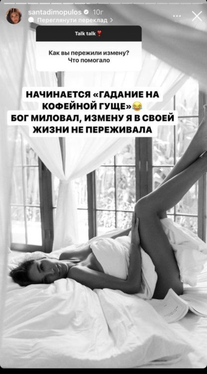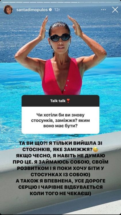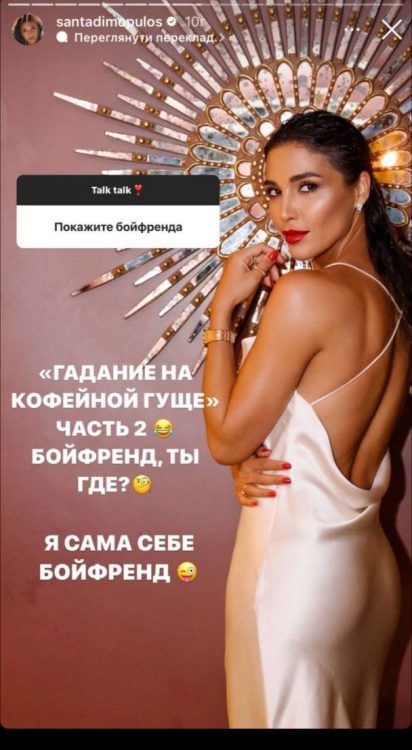 Санта Дімопулос заявила, що хоче насолодитись самотністю, тому поки не хоче заводити відносини. “Та ви що? Я тільки вийшла зі стосунків, яке заміжжя? Якщо чесно, я навіть не думаю про це. Я займаюся собою, своїм розвитком, я поки хочу бути у стосунках із собою Також я впевнена, усе дороге серцю і чарівне відбудеться, коли на те не чекаєш”, – прокоментувала Санта Дімопулос.
