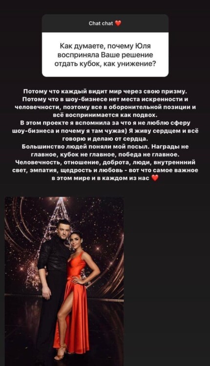Вона прокоментувала все тим, що в шоу-бізнесі немає людяності та щирості. Кожна людина дивиться на цей світ через свою призму. Хтось бачить у всьому лише негатив, а хтось випромінює доброту. Переможниця шоу “Танці з зірками” заявила, що шоу-бізнес для неї завжди був чужим. Вона ніколи не почувалася в ньому комфортно.