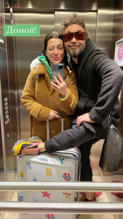 Разом з дружиною він зробив фото у ліфті. Перед камерою чоловік постав у штанах, чорному худі та стильних кросівках. Поруч позує кохана дружина Бабкіна. Жінка одягнула пальто коричневого кольору. На фото вона тримає валізу та усміхається.