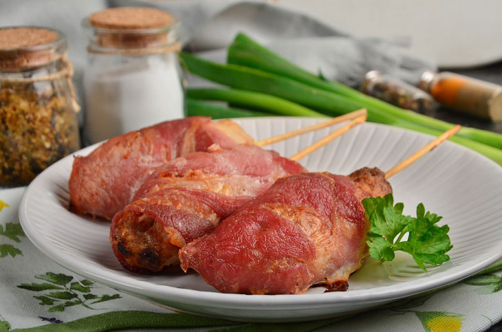 4. З фаршу потрібно приготувати котлети, які потім нанизують на дерев’яні шпажки і загортають в пластики бекону. За формою має вийти як ескімо: зовні бекон, а всередині фарш.