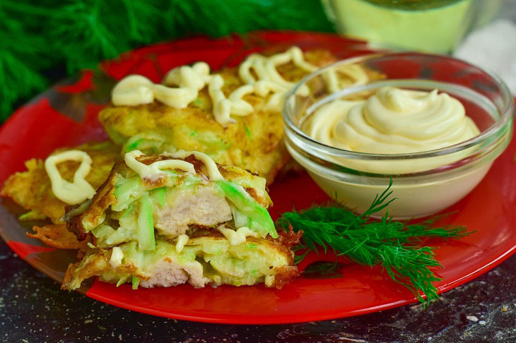 6. Зверху потрібно викласти кабачки, що залишилися, зробити форму біляшів, підрівнявши масу ложкою. Обсмажувати ліниві біляші потрібно на середньому вогні з двох сторін до красивого золотистого відтінку.