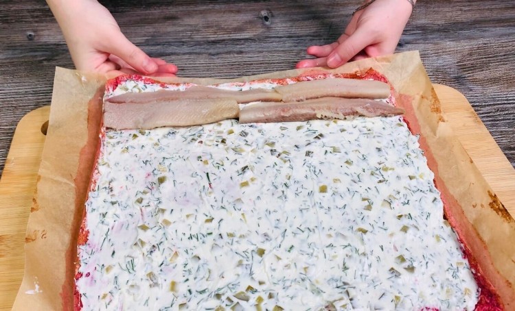 7. На один край викладаємо нарізане на смужки філе слабосоленого оселедця. Його кількість можна варіювати залежно від уподобань.