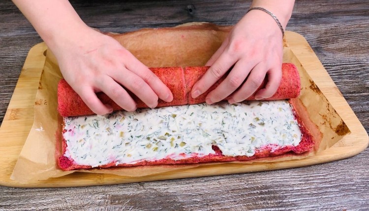 8. Щільно закручуємо в рулет і заготаємо в харчову плівку. Прибираємо в холодильник на 3-4 години або на ніч.