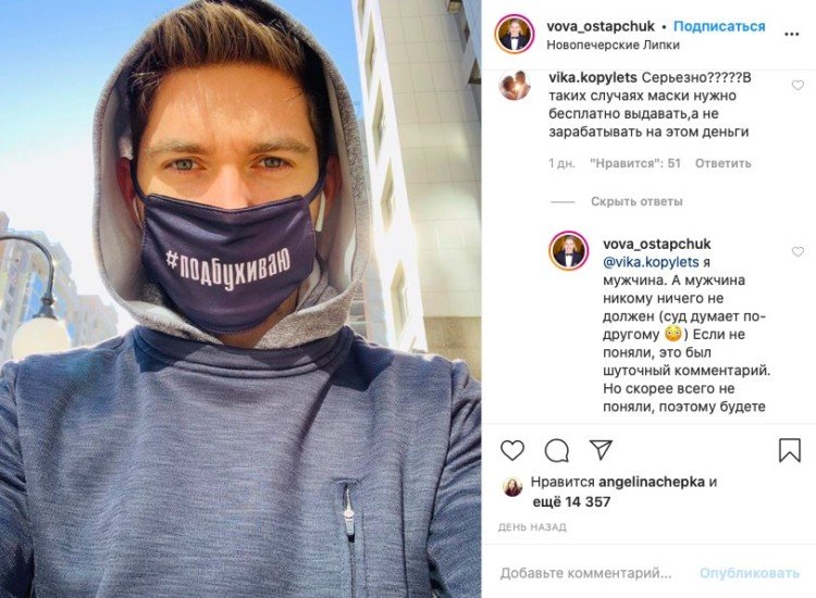 У коментарях дописувачі обурилися, що Володимир Остапчук займається реалізацією захисних масок у сьогоднішніх реаліях. Під одним із гнівних коментарів телеведучий вирішив пожартувати на цю тему: “Я чоловік. А чоловік нікому нічого не винен (суд думає по-іншому). Якщо не зрозуміли, це був жартівливий коментар. Але скоріш за все не зрозуміли, тому будете писати гнівні коментарі”.