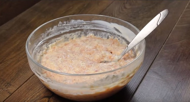 У миску до фаршу виливають яйце, додають весь кефір. Отриману масу слід ретельно перемішати, довівши до повної однорідності.