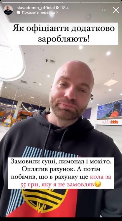 Слава Дьомін розповів, що відвідав один зі столичних ресторанів. Там шоумен замовив суші, мохіто та лимонад. Коли Славі Дьоміну принесли чек, то він помітив, що там додаткові 55 гривень за Coca-Cola, яку чоловік не замовляв. Ведучий відразу викликав офіціантку, адже така ситуація його неабияк обурила.