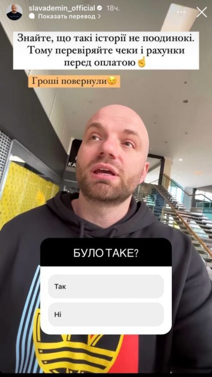 Також чоловік порекомендував уважно передивлятися чек перед оплатою, аби не стати жертвою шахраїв. А ще Слава Дьомін поцікавився у своїх підписників, чи траплялась з ними така ситуація. Юзери відповіли на публікацію шоумена й похвалили його за пильність та уважність.