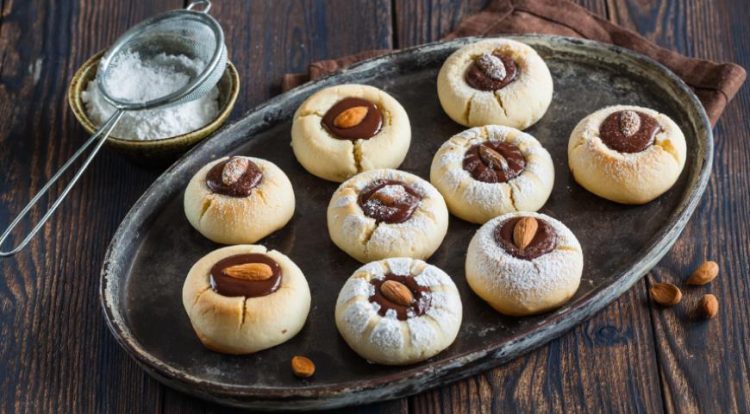 З тіста формуємо кульки невеликого розміру та викладаємо на деко, застелене пергаментом. В центрі кожної кульки робимо заглиблення. Викладаємо туди розтоплений шоколад та волоський горіх.