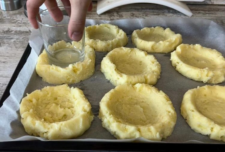Розклавши картопляні кульки по деку, склянкою робимо заглиблення для начинки. Склянку краще трохи змочити водою, щоб картопля не прилипала. Якщо краї картоплі розповзлися, просто підправте їх пальцями.