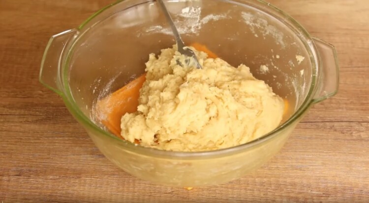 Далі до маси всипаємо 250 г просіяного борошна і замішуємо тісто