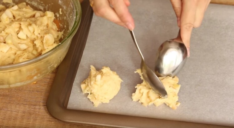 Потім за допомогою 2 ложок кладемо наше тісто на деко застелене папером для випічки і відправляємо в розігріту до 180 градусів духовку на 20 хвилин