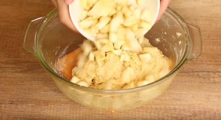 Тепер до тіста додаємо яблука нарізані дрібними кубиками і перемішуємо