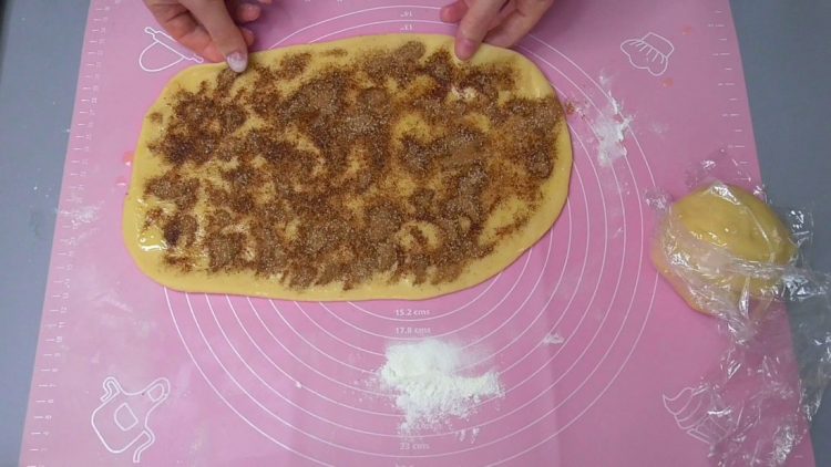 Отже, ділимо тісто на 3 частини. Кожну частину розгортаємо пласт, товщиною 4-5 мм. Змащуємо його маслом і посипаємо корицею. Згортаємо тісто вдвічі, знову змащуємо маслом і присипаємо корицею.