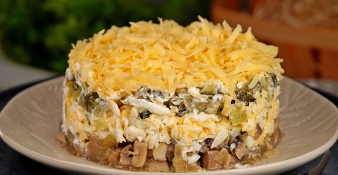 На вигляд цей салат нереально апетитний та смачний. Для його приготування знадобляться прості інгредієнти. Салат з печерицями, маринованими огірками та сиром обов’язково подавайте до святкового столу.