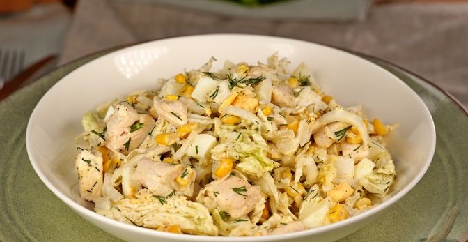 Такий салат дуже простий у приготуванні. Він складається з небагатьох інгредієнтів. Салат з куркою, пекінською капустою та кукурудзою оцінять всі гості. Він дуже апетитний та ситний.