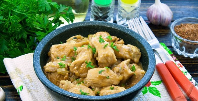 Філе індички, тушковане з цибулею в сметані та соєвому соусі