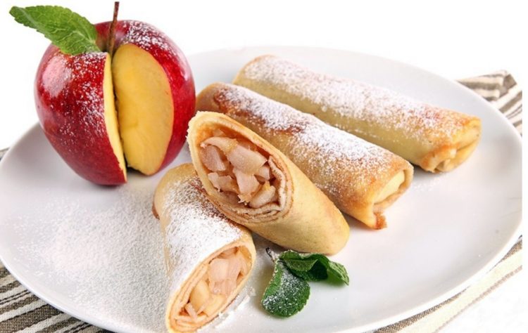 Яблука промиваємо під водою та очищуємо від шкірки. Нарізаємо кубиками. До яблук додаємо корицю та перемішуємо. Начинка готова. Викладаємо її на кожний млинець та загортаємо у конвертик.