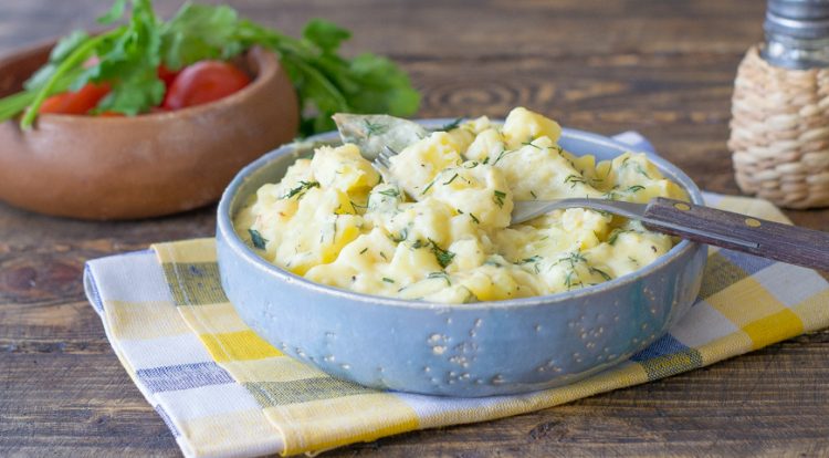 Ріпчасту цибулю дрібно нарізаємо та додаємо до картоплі. Варимо її до готовності. Додаємо сметану й натертий сир. Ретельно перемішуємо.