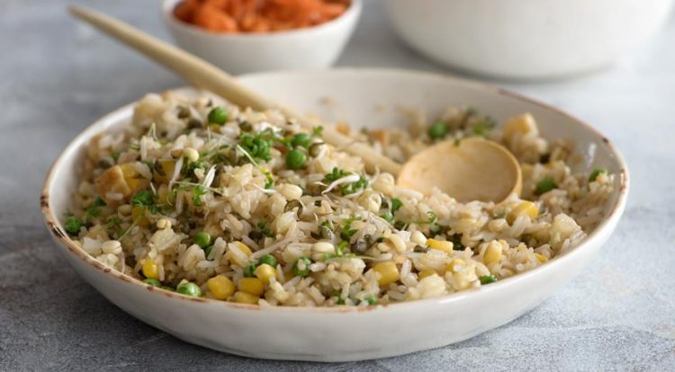 Потім додаємо кукурудзу та горошок. Перемішуємо. Вливаємо яєчну суміш. Також додаємо паростки квасолі. Ретельно перемішуємо. Солимо, перчимо й додаємо спеції за смаком. Рис готуємо до готовності. Знімаємо з вогню й відразу подаємо до столу. Смачного!