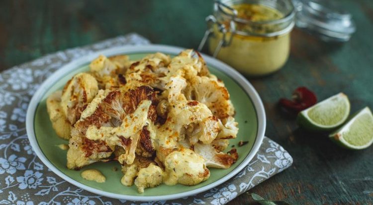 Запечену цвітну капусту викладаємо на тарілку. Поливаємо готовим соусом та відразу подаємо до столу. Смачного!