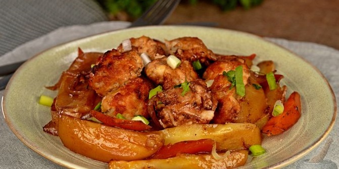 Страва настільки смачна та ситна, що вмить зникає зі столу. Вона дуже ароматна та апетитна. Запечена картопля з фрикадельками чудово смакує гарячою. Таку страву обов’язково повинні скуштувати Ваші гості.