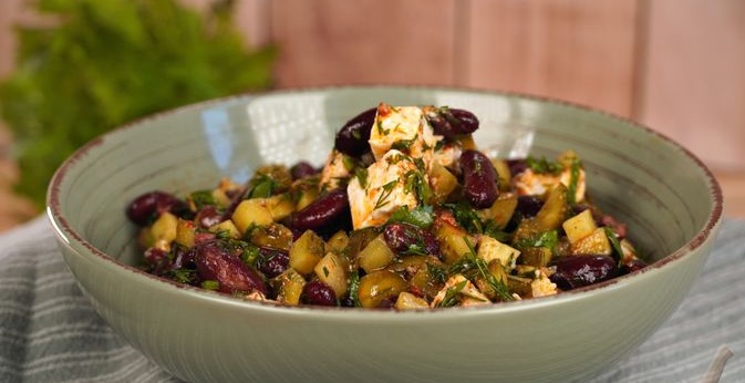 Цей салат дуже простий у приготуванні. Він складається з бюджетних інгредієнтів та виходить нереально смачним. Обов’язково приготуйте салат з квасолею, маринованими огірками та фетою для своєї сім’ї.