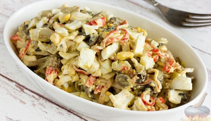 Цей салат виходить не тільки смачним, а й дуже ситним. Для його приготування необхідно підготувати небагато інгредієнтів. Салат з грибами має ніжний смак та апетитний на вигляд.