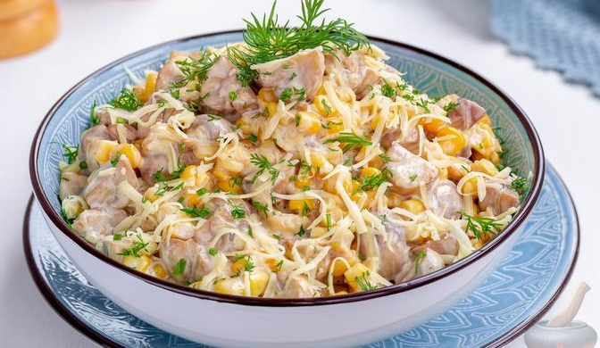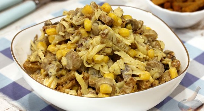 Для приготування такого салату знадобиться небагато інгредієнтів. Він виходить дуже ситним та смачним. Обов’язково приготуйте страву за цим рецептом.