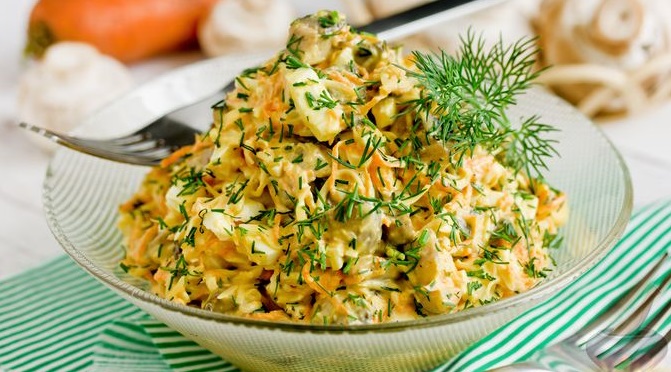 Цей салат складається з простих інгредієнтів, а виходить неймовірно смачним. Готується він за лічені хвилини. Салат з печерицями, морквою та яйцями можна подавати до святкового столу. Ваші гості точно оцінять таку смакоту.