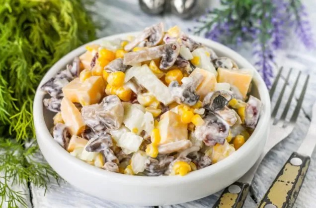 Салат простий у приготуванні. Він складається з бюджетних інгредієнтів та виходить дуже ситним. Салатом з грибами та кукурудзою можна пригощати гостей. Страва має ніжний смак та апетитний вигляд.
