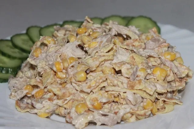 Відварене куряче філе розбираємо на волокна та з’єднуємо з омлетом. Потім додаємо консервовану кукурудзу. Солимо, перчимо. Салат заправляємо майонезом та подаємо до столу. Смачного!