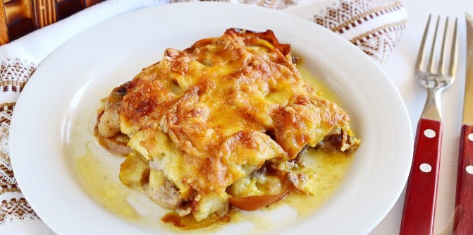 Яблука нарізаємо кружечками. Половину викладаємо у форму для запікання та поливаємо розтопленим вершковим маслом. Свинину нарізаємо на шматочки. Викладаємо на яблука. Солимо та перчимо за смаком. Знову викладаємо яблука.