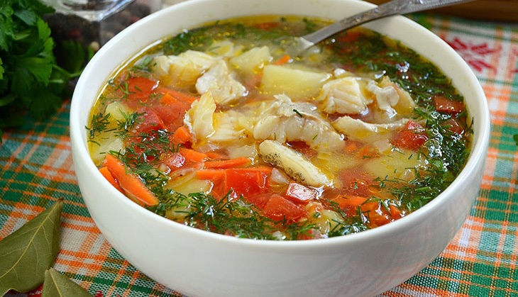 Рибу очищуємо від кісток та нарізаємо на шматочки. Заливаємо водою та ставимо на вогонь. Рибу варимо до готовності. Тим часом нарізаємо кубиками картоплю та помідори. Цибулю й моркву подрібнюємо та обсмажуємо на сковорідці.