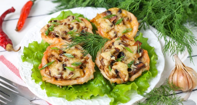 Куряче філе нарізаємо на однакові шматочки. Трохи їх відбиваємо. Потім шматочки м’яса змащуємо сіллю, перцем та спеціями. Викладаємо їх у форми для кексів. Печериці подрібнюємо та обсмажуємо на сковорідці. Твердий сир натираємо на тертці.