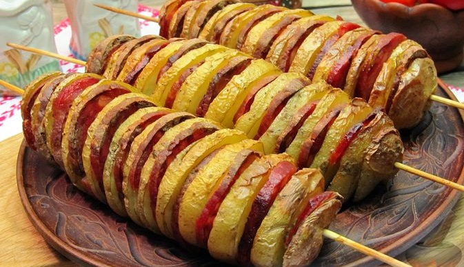 Картопля виходить дуже апетитною та смачною. Така гаряча закуска точно сподобається Вашим рідним та гостям. Запечена картопля з ковбасою на шпажках проста у приготуванні й дуже ситна.