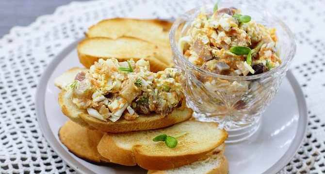 Така закуска чудово смакуватиме з тарталетками або грінками. Готується вона просто та швидко. Закуска з оселедця з плавленим сиром, морквою та яйцями точно сподобається всій сім’ї.