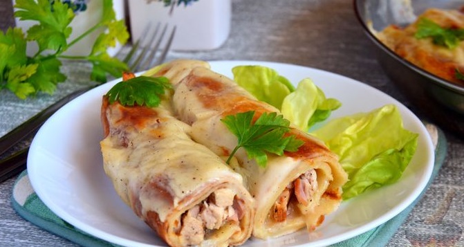 Млинці з шинкою, індичкою та сиром під соусом бешамель