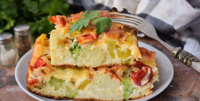 Запіканка з броколі, цвітною капустою, солодким перцем та помідорами