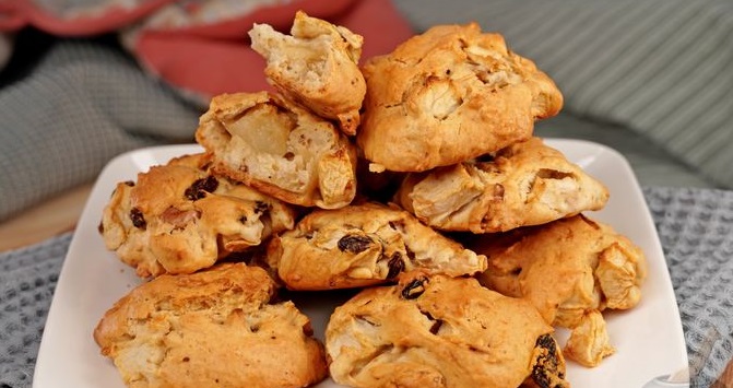 Вкінці поступово всипаємо борошно та розпушувач. Замішуємо тісто. До нього додаємо подрібнені горіхи, родзинки та нарізані кубиками яблука. Все перемішуємо.