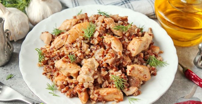 Страва готується за лічені хвилини, а виходить дуже ситною. Обов’язково подавайте її до столу в гарячому вигляді. Гречка з куркою, грибами, сиром та вершками ніжна на смак й ароматна.