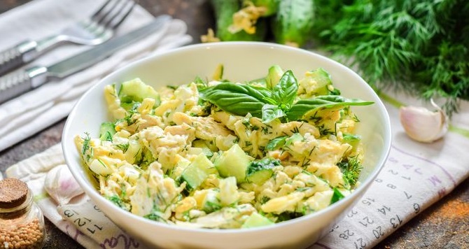 Для приготування такого салату знадобляться дуже прості інгредієнти. Він виходить соковитим, ситним та апетитним на вигляд. Салат з куркою, огірками, сиром та яйцями оцінить вся Ваша сім’я.