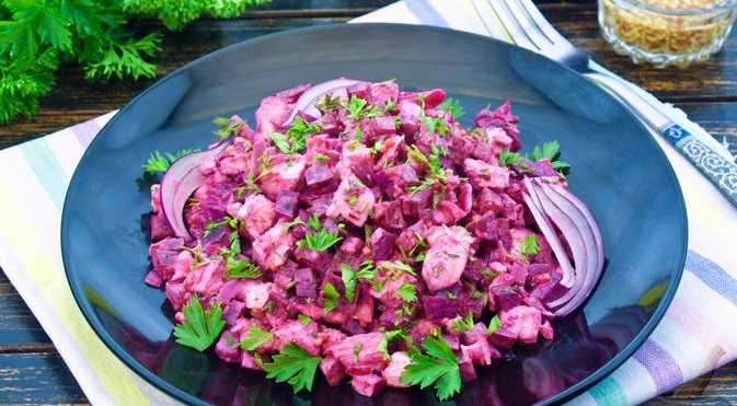Спочатку замаринуємо цибулю. Нарізаємо її півкільцями. Додаємо воду, оцет, цукор та щіпку солі. Залишаємо на деякий час. Буряк та куряче філе відварюємо заздалегідь. Інгредієнти нарізаємо кубиками та викладаємо в миску.