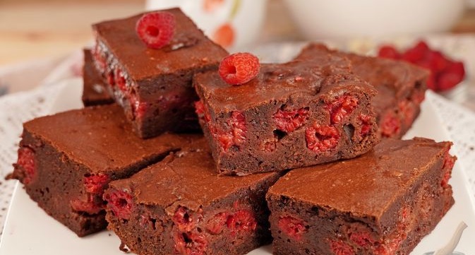 Половину викладаємо у форму для запікання. Додаємо малину, а потім поливаємо рештою тіста. Брауні випікаємо 20 хвилин при температурі 180 градусів. Смачного!
