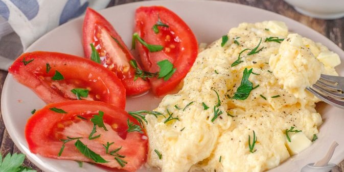 Накриваємо кришкою та варимо 20 секунд. Потім проціджуємо та викладаємо яєчню на тарілку. До столу її подаємо зі свіжими помідорами та зеленню. Також зверху на яєчню викладаємо нарізане вершкове масло. Смачного!