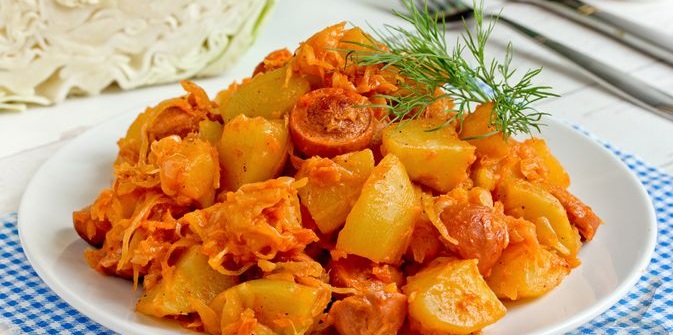 Капуста, тушкована з картоплею та сосисками