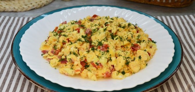Вливаємо туди яєчну суміш та готуємо приблизно хвилину. Бринзу розминаємо виделкою. Додаємо до омлету та все перемішуємо. Також всипаємо дрібно нарізаний кріп. Омлет смажимо до готовності та подаємо до столу. Смачного!