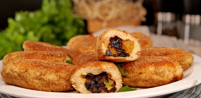 Все ретельно перемішуємо. З фаршу робимо кульки та трохи їх розкочуємо. Викладаємо сухофрукти та формуємо зрази. Потім обвалюємо їх в панірувальних сухарях. Зрази обсмажуємо до золотистої скоринки та відразу подаємо до столу. Смачного!