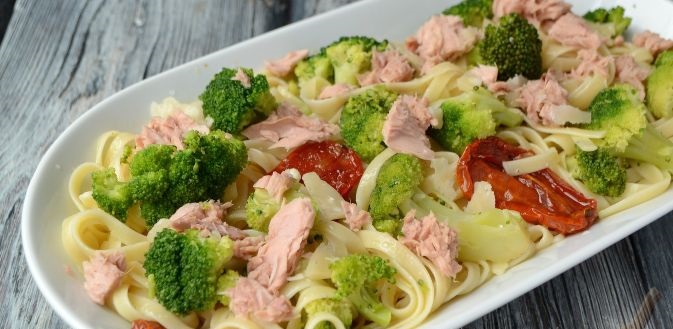 Страва готується за лічені хвилини, а виходить просто бездоганною. Макарони з тунцем, броколі та в’яленими помідорами точно Вам сподобаються. Вони дуже ситні, апетитні та швидкі у приготуванні.