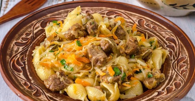Страва швидка у приготуванні, дуже ароматна та смачна. Макарони з м’ясом й тушкованою капустою чудово смакуватимуть в гарячому вигляді. Вони дуже ситні та бюджетні. Обов’язково приготуйте цю страву.