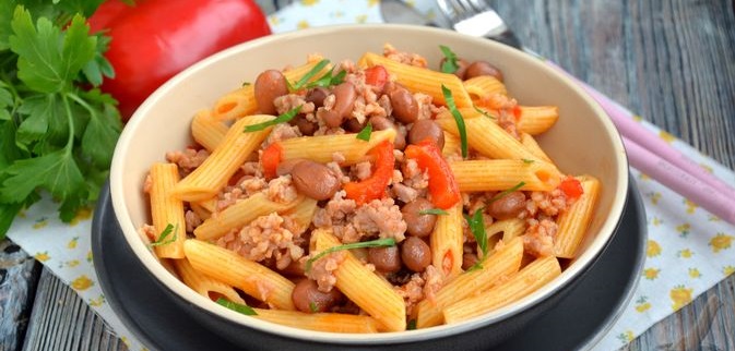 Макарони з фаршем, консервованою квасолею та солодким перцем